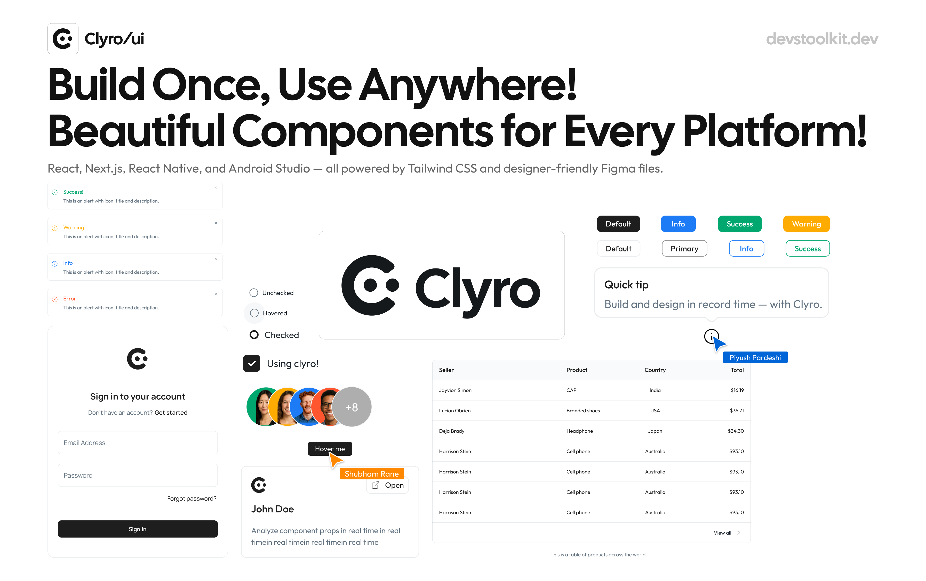 Clyro is a unified design + dev component library for React, React Native, and Figma. We help teams ship faster with perfectly synced components across platforms.